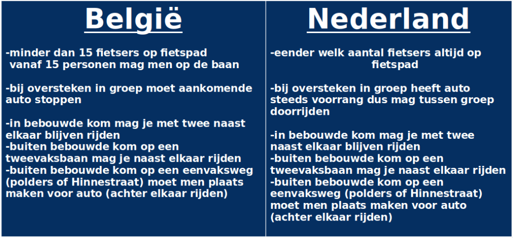 - Opgelet : in Nederland zijn de regels anders: fietsers moeten steeds op het (gelukkig breder en beter) fietspad blijven.